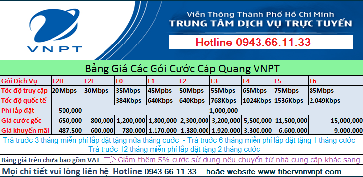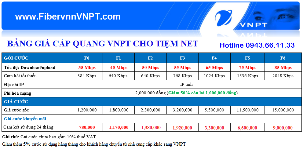 (*): Giảm cước tối đa 45% cho khách hàng từ nhà cung cấp khác chuyển sang cáp quang vnpt và đăng ký từ gói F2 trở lên